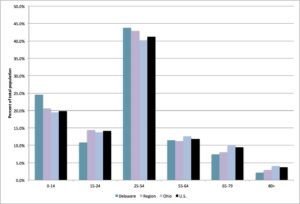 Age Distribution, Delaware County, Columbus Region, Ohio, and U.S., 2010